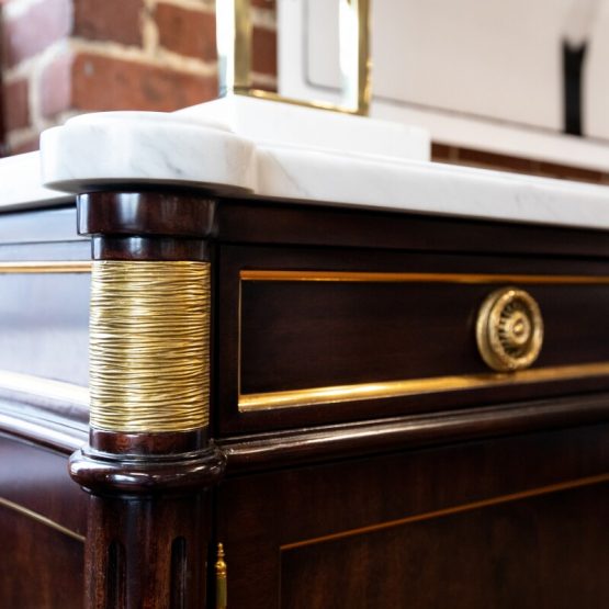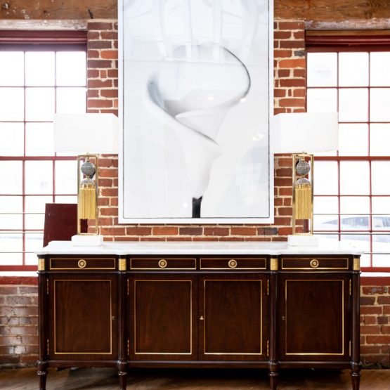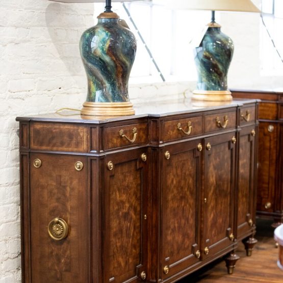 The “Hamilton Sideboard” from Theodore Alexander offers is than just a unique home furniture piece. Taking inspiration from an antique French buffet sideboard, the marble top features molded corners and concave sides. The solid brass cast hardware against the dark mahogany finish adds drama. Elegant and functional, this sideboard is another beautifully customizable piece from Theodore Alexander, available in over 40 specialty finishes.