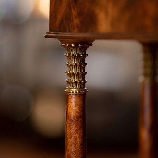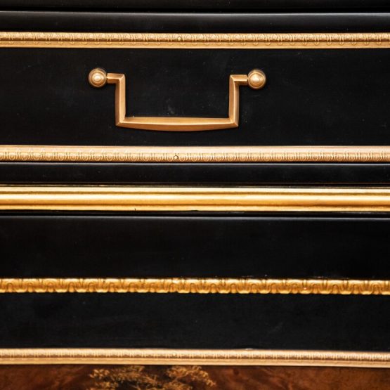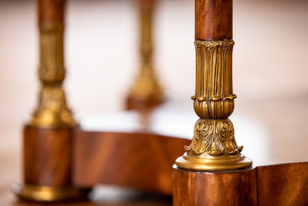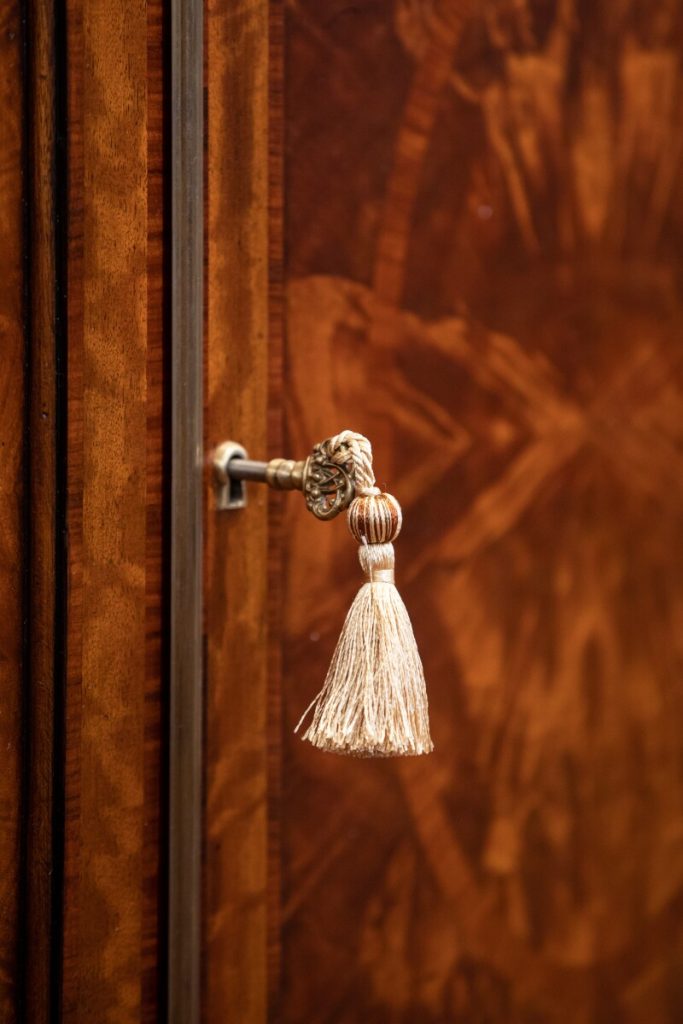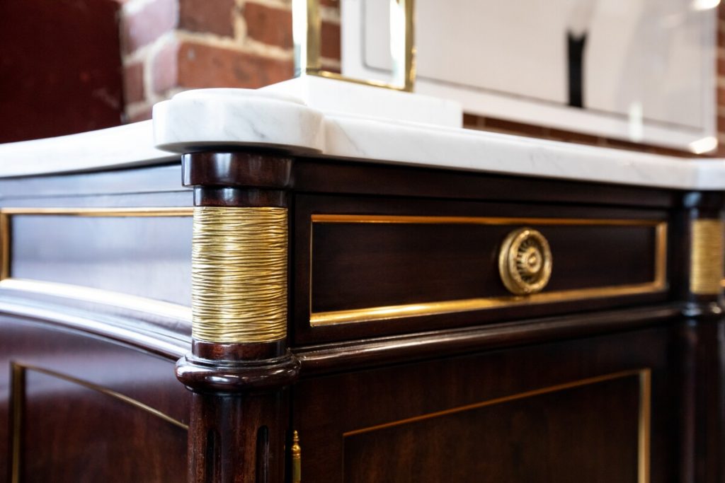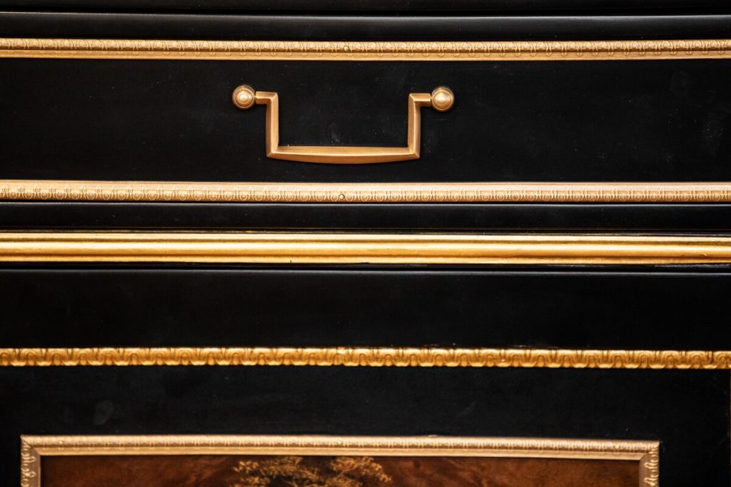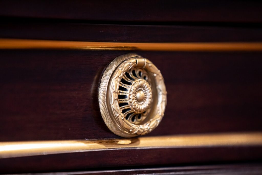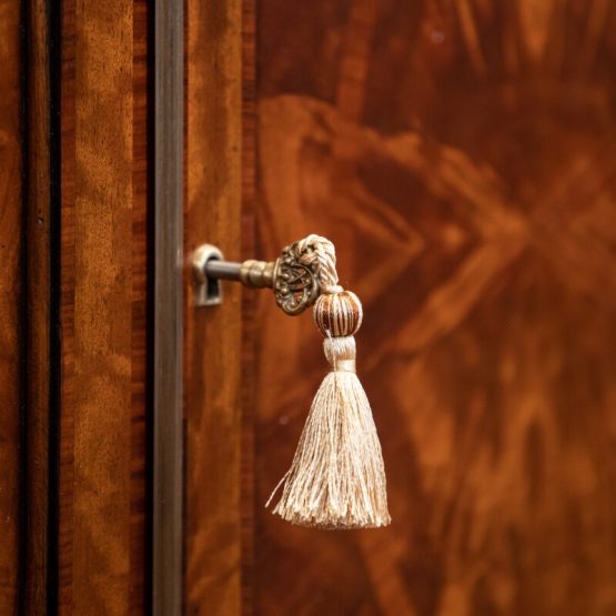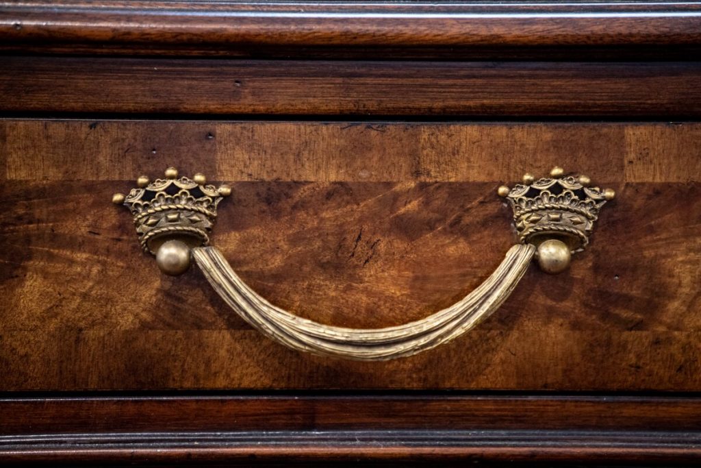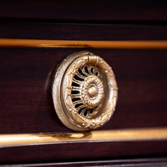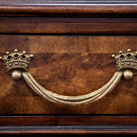 These methods provide incredible patterns and distinctions on the wood, and virtually all must be done by hand. Elaborate brass or other metal hardware details, such as intricate crowns, figures and animals, are also meticulously designed to pull the viewer into a closer appreciation of such unique home furniture.