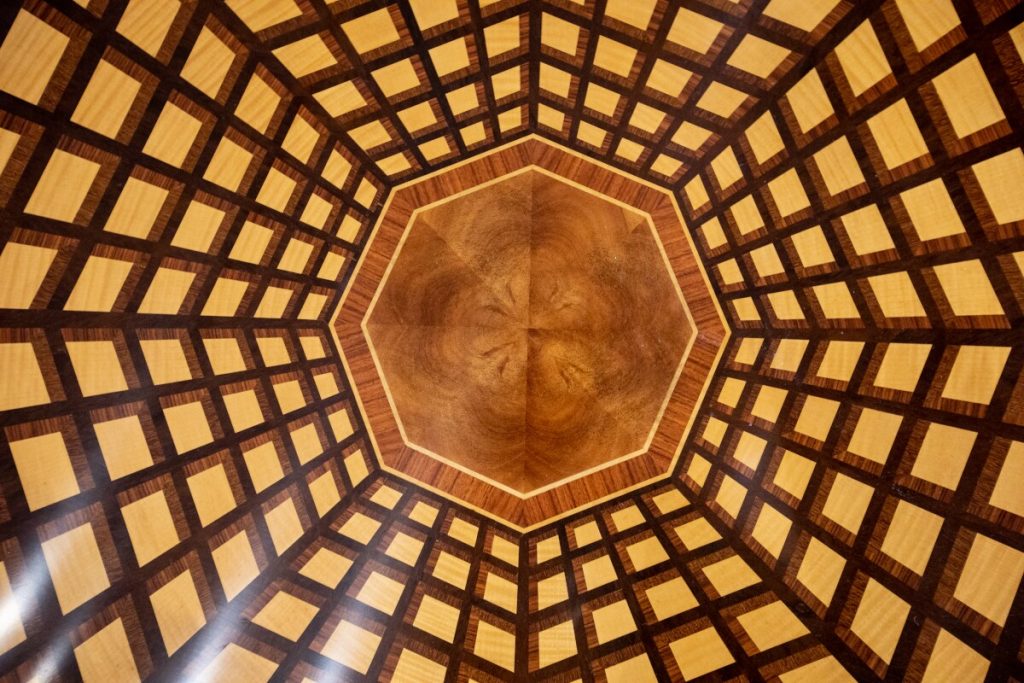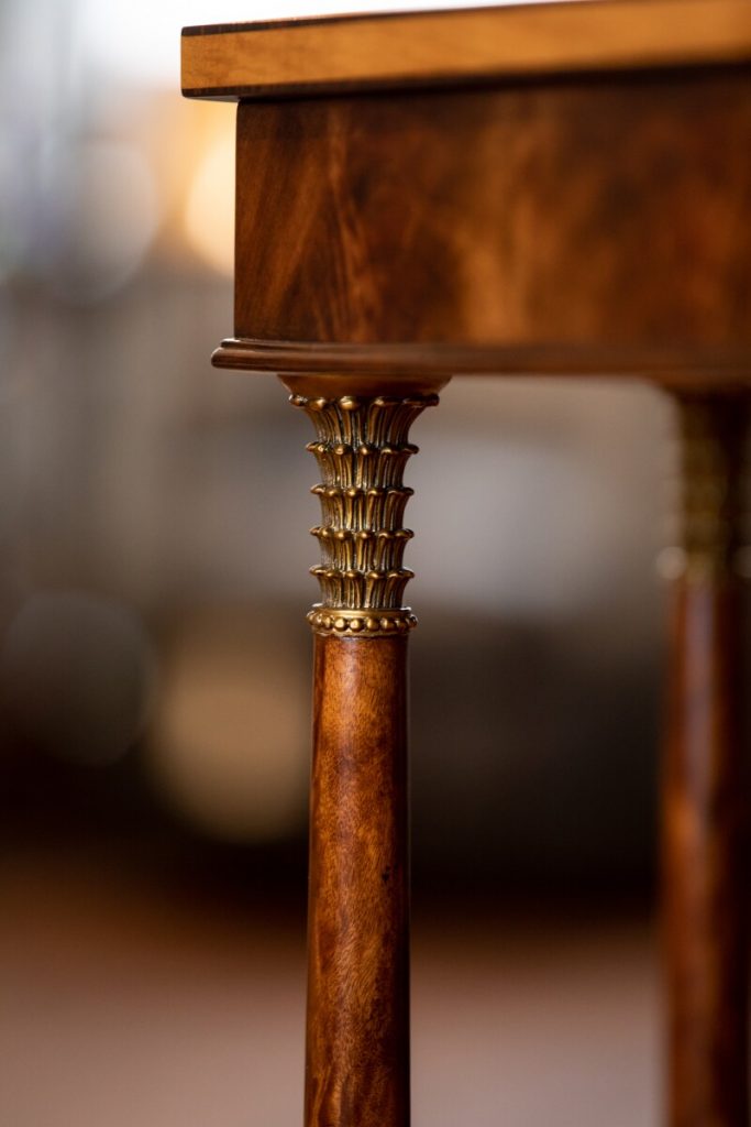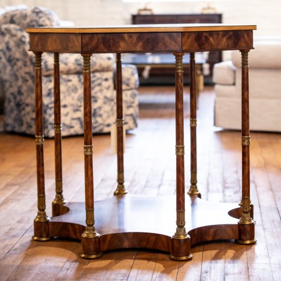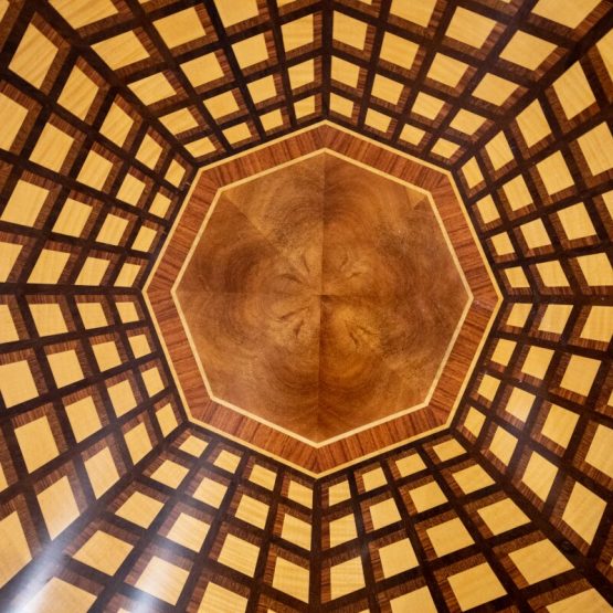 Another diminutive piece that makes a strong statement is Theodore Alexander’s “Inspiration Centre Table.” A center table perfect for entrance ways and other small areas, the incredible marquetry veneering gives depth, while the octagonal coffered ceiling design is an unexpected twist.