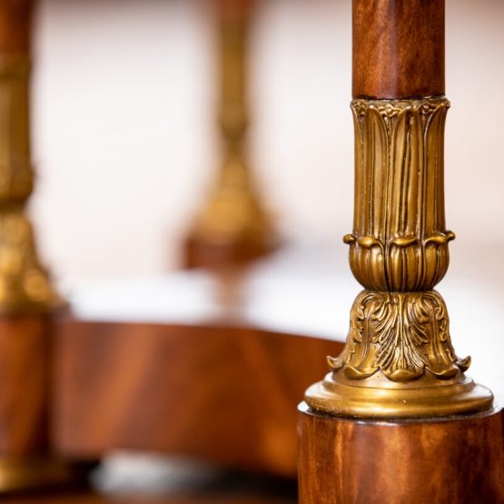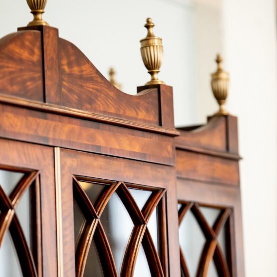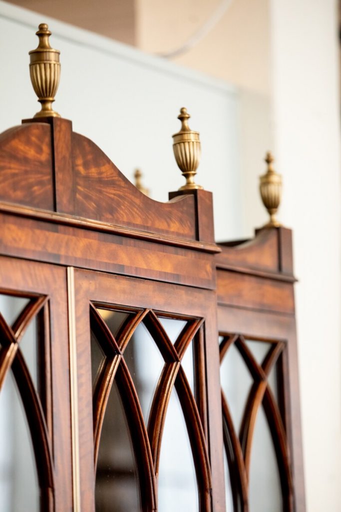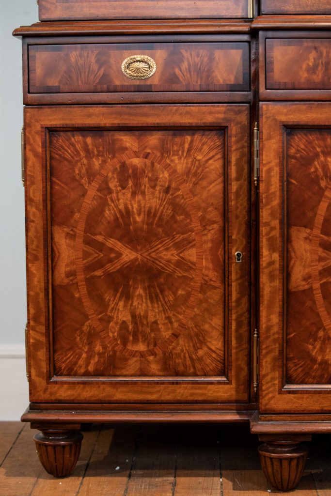 The “Grand Designs Bookcase/Cabinet” (from the top) features carefully etched brass urn finials to four oval inlaid cupboard doors, this multifunctional piece highlights a key detailing difference to watch for: inlay. Inlay is generally known as wood or any type of decoration applied to the surface of wood. Spotted on the cupboard doors is a mahogany veneer inlay. Theodore Alexander specializes in this centuries-old, painstaking technique known for giving a rich, dimensional feel to each piece.