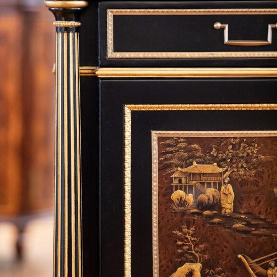 If you’re still undecided about inlays and veneering, we at Green Front Furniture will make the choice easy for you. The “Daguerre Chinoiserie Cabinet” from Theodore Alexander packs a lot of punch for a relatively small piece. With two hand-painted chinoiserie scenes and a base with bound reed carved details and fluted columns, this compact but elegant cabinet is proof that you don’t have to go all out on a large piece to let details shine.