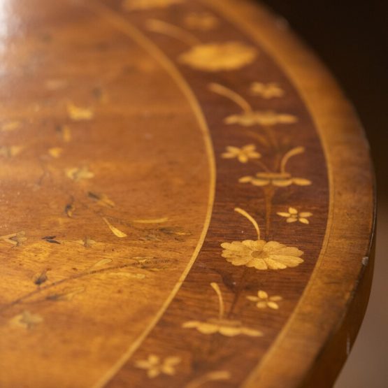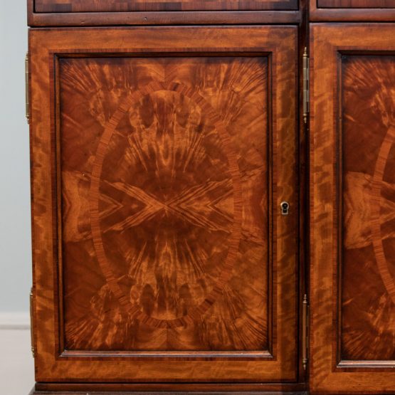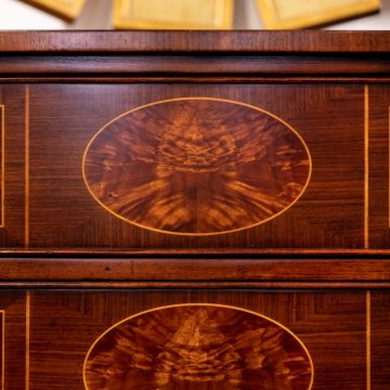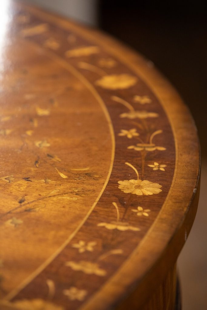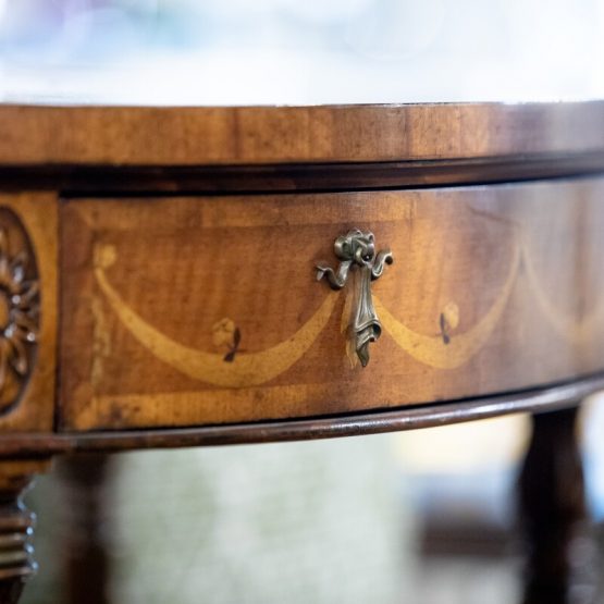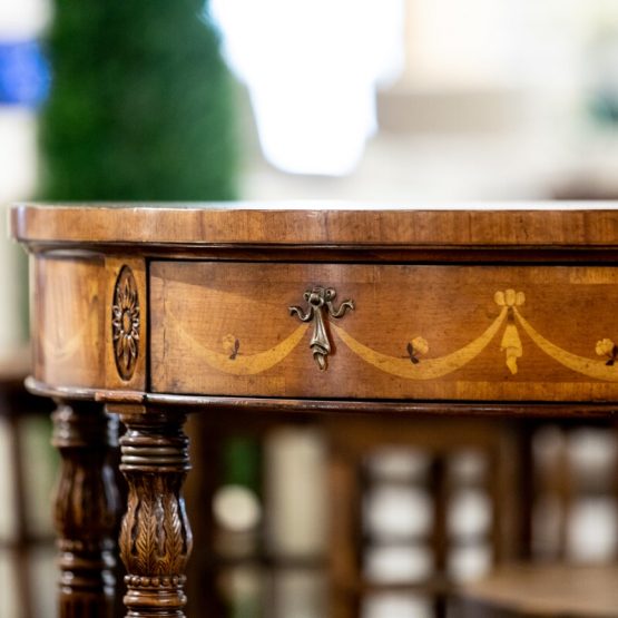 The Jonathan Charles “Adam style satinwood console” is full of small, perfect details. From the tiny hardware swags along the curved side to the exquisite but understated floral inlaying on top, this side table features a drawer and a flame-veneered underlier.