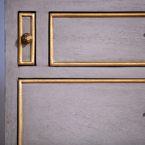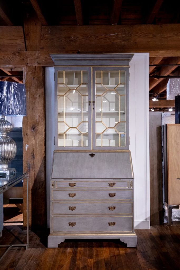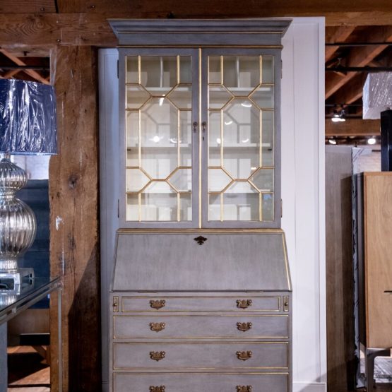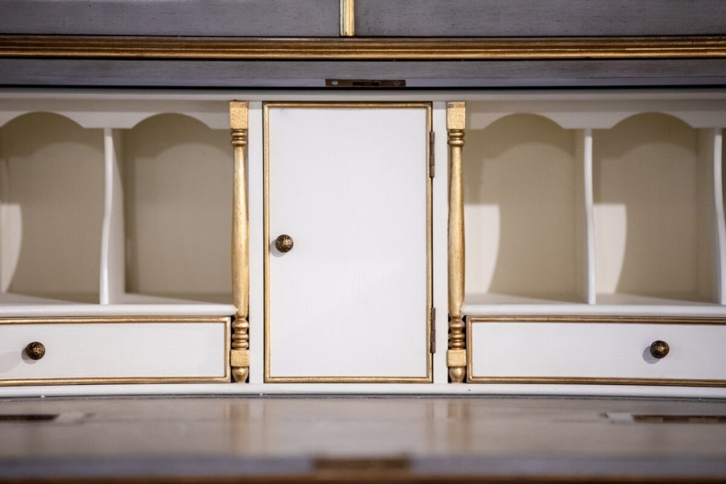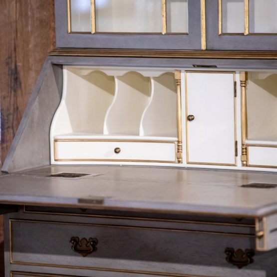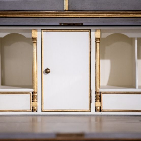 The “Gray and Gilded Secretary Desk” puts Jonathan Charles’ commitment to detail on full display. From top to bottom, this remarkable piece is filled with amazing (and tiny) details. Starting with the three adjustable shelves within, the fall front of the lower section includes a fully lined curved interior with an inset leather writing surface.