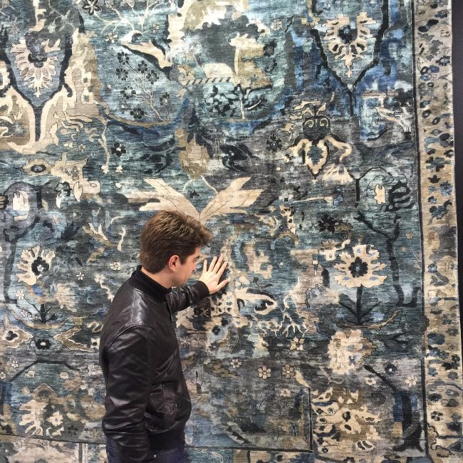 Den has a moment with this beautiful and massive silk rug, a study in intricacy and shades of blue. Abstract, high-end silk creations are also on the buying plan for the team today, to be beautifully displayed against the crispness of the White Room back in Virginia.