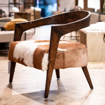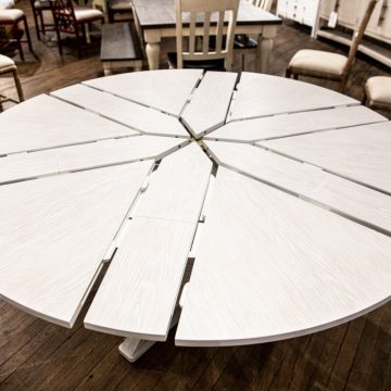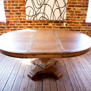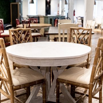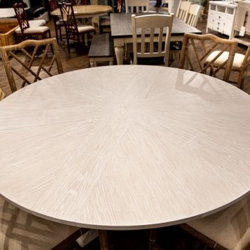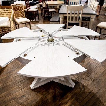 Sarreid’s Jupe table provides a unique, space-saving solution with an elegant, butterfly-leaf design. Four turned legs in a vase-shape sit atop a trestle base, and the classic table top features a fine, straight grain. At just 64”, this table fits nicely in a smaller area but can be expanded to 84” to seat 10 comfortably. The unique design allows the top to pull apart to form pie-shaped wedges, between which hidden interior “butterfly leaves” unfold to expand the table. You can see the Jupe table in action at Green Front Farmville in Building 8.