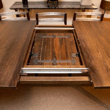 You’ll find this stylish Salk Dining table in Building 6. The industrial design features sculpted concrete legs and a solid oak table top with a fashionable charred or seared finish. However, the true genius of this table is its clever, easy-to-use, hinged extension mechanism, which allows a single leaf to fold and store neatly beneath the center.