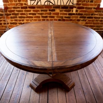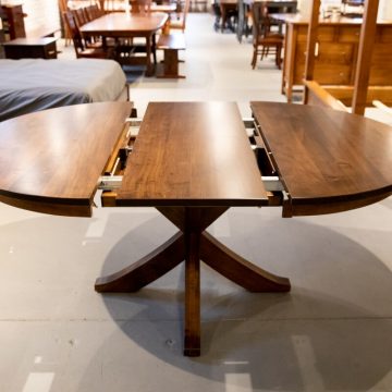 This single-pedestal table features elegant, sloping legs and a butterfly-leaf design with panels that fold and nestle into a slot under the center of the top when not in use. At 48” round, the table shape expands to an oval using one or more 12” leaves in order to accommodate extra guests. For durability, three coats of rich, post-catalyzed varnish protect the table’s surface from liquids, heat, and even nail polish remover. It’s the perfect combination of beauty and durability.