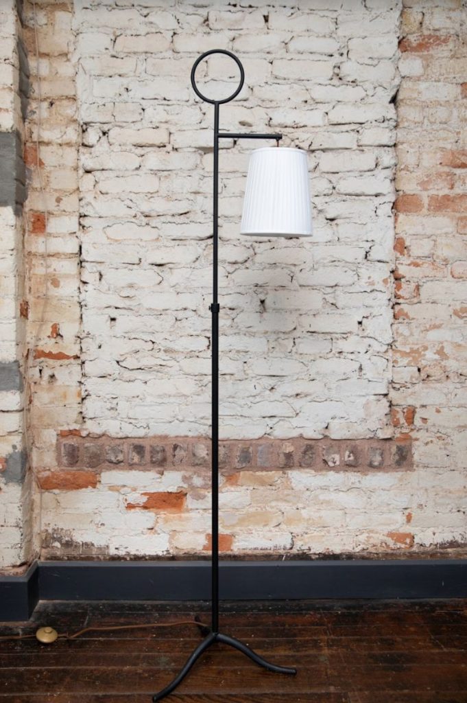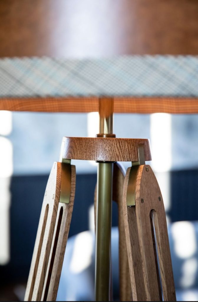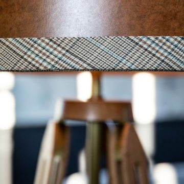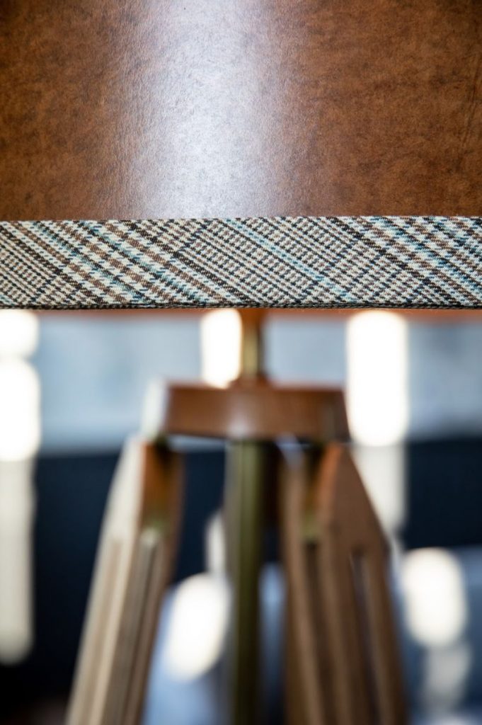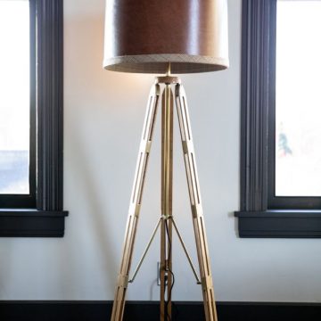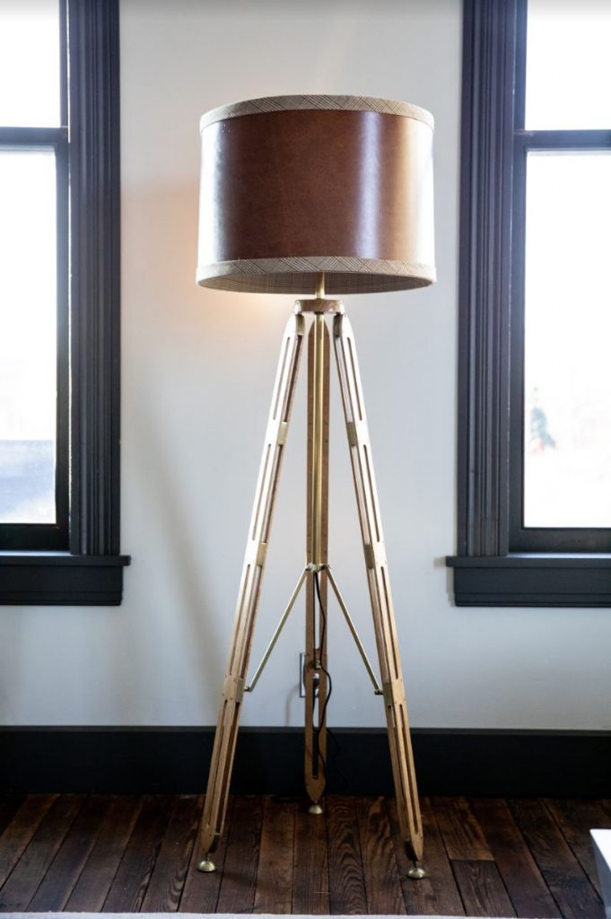 Inspired by the Italian designer Ico Parisi, circa 1950, the ultra-masculine Architectural Floor Lamp by Jonathan Charles features a leather shade with plaid details. It stands on three rich oak legs with brass fittings – the epitome of equestrian style.