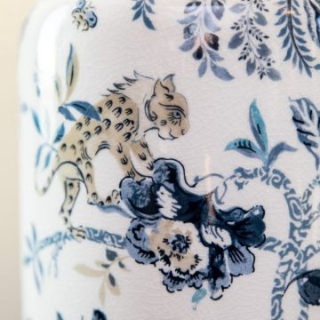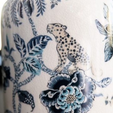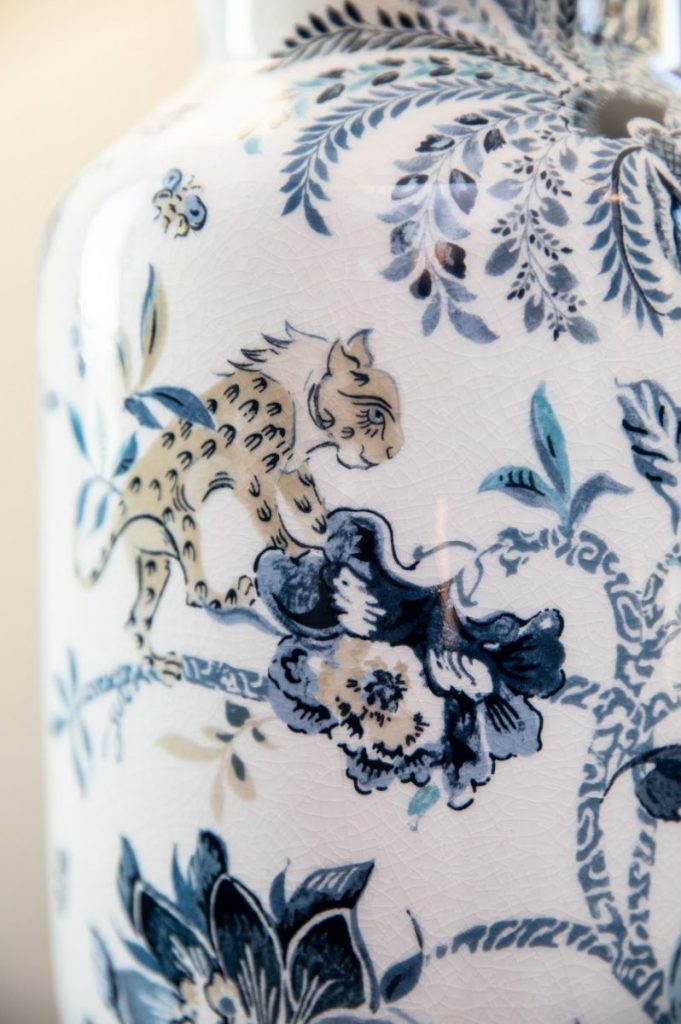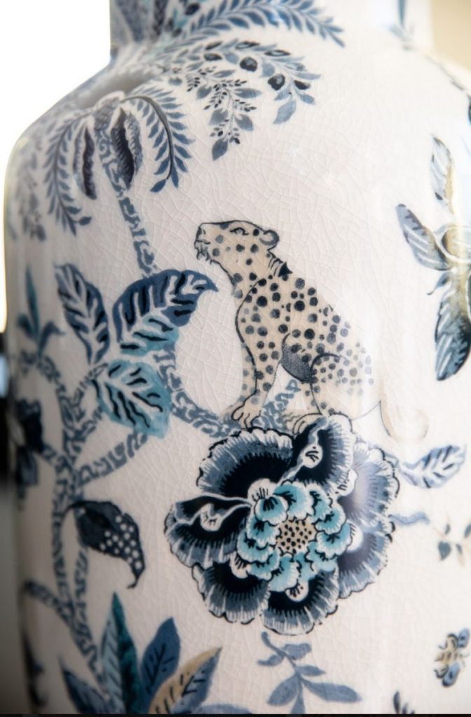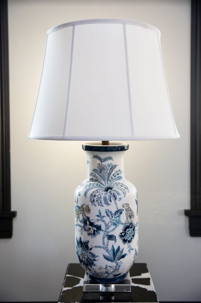 The Brazanga Blue Lamp from Port 68 is a traditional masterpiece. Featuring chinoiserie—the colorful blue adaptation of linen printed fabrics popularized by Portuguese trade routes to British East India—this lamp has aged brass hardware and a square lucite base. The pattern featured is classic and colorful. The craquelure effect on the base combines with light-hearted depictions of jungle cats making this lamp perfect for rounding out traditional decor.