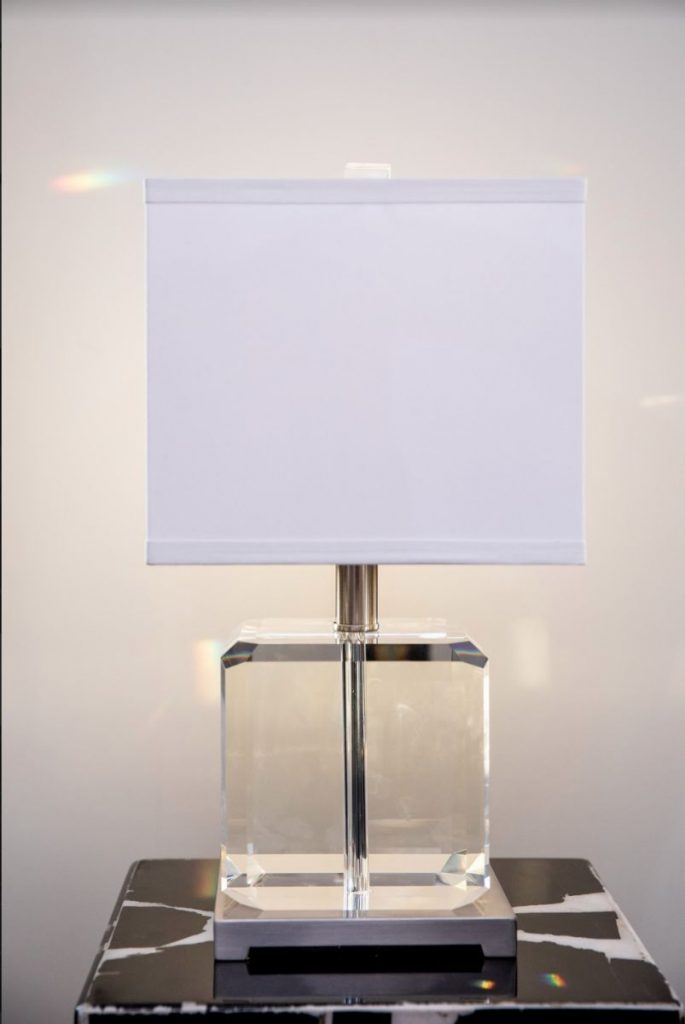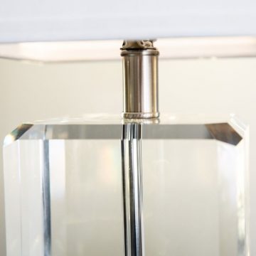 The Wildwood Mini Me Lamp features solid crystal on an old silver mounting. Compact and simple, this lamp epitomizes modern style with its true white silkette shade. Measuring only 18 inches high, the demure scale is part of the big appeal of this stylish lamp.