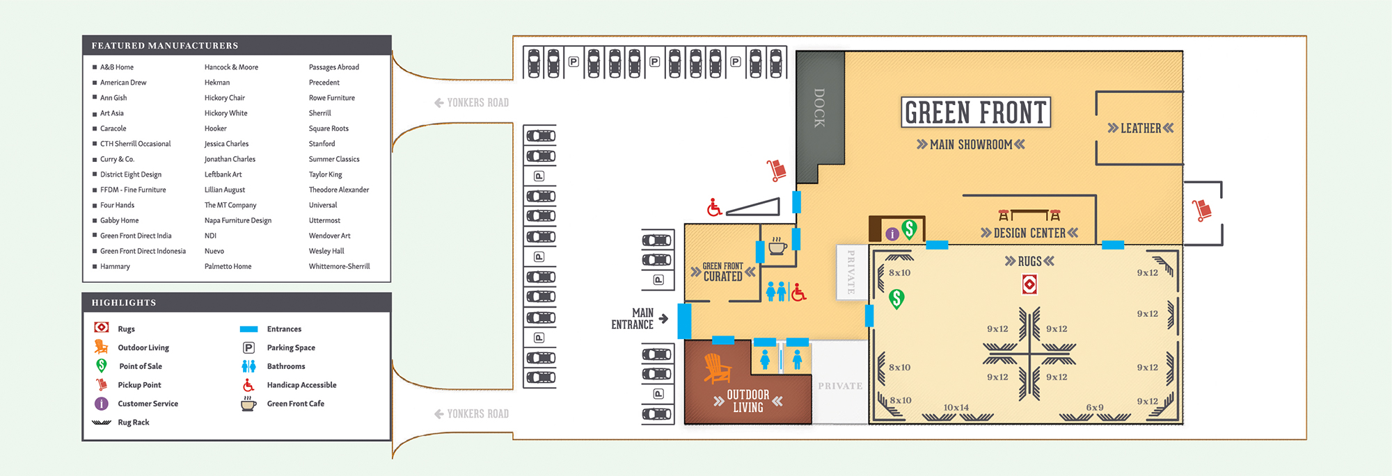 Green Front Interiors and Rugs is a lively entrée into the Green Front experience. Whether you discover your perfect item or special order to your tastes, there are 30,000 square feet of inspiration. Reawaken your love of design in our showroom, replete with almost every conceivable piece to make your living or workspace.