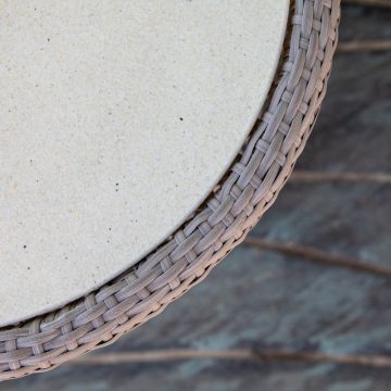 The Echo end table from Summer Classics features the ultra-durable Superstone with resin wicker base.